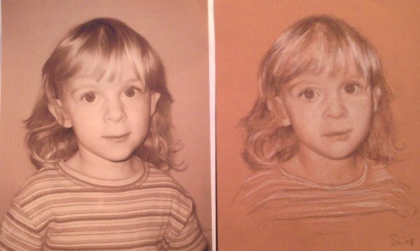 links das Originalfoto, rechts die Zeichnung mit Kreide, Rötel- und Bleistiften